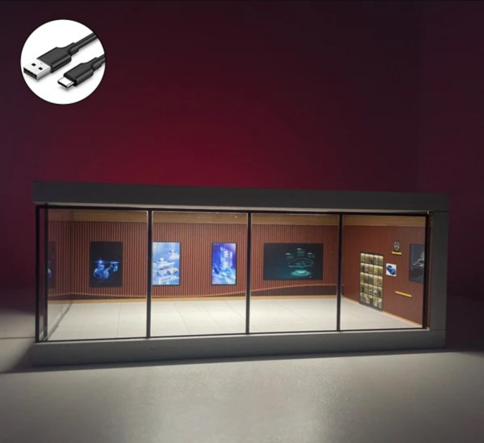 Materjal: kvaliteetne läbipaistev akrüül Välimised mõõtmed: 26,5 x 10,5 x 15 cm (laius x sügavus x kõrgus) Sisseehitatud USB LED valgustus Liuguksed, vahetatavad lihtsaks ligipääsuks mudelitele Tolmukindel korpus Võimalus virnastada mitu üksust ruumi säästmiseks Sobib 1:64 mõõtkava mudelitele Autode mudeleid komplektis ei ole