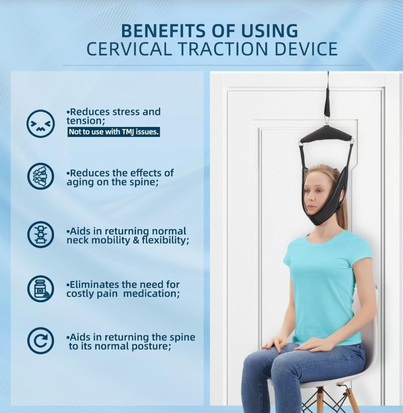 1× Dispozitiv de întindere a gâtului 1× Curea de tracțiune 1× Opritor pentru ușă 1× Suport pentru cap cu căptușeală 1× Instrucțiuni de utilizare